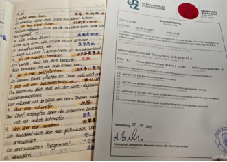 在开学前的语言班上,我的同学来自匈牙利、波兰、巴西、法国……课堂讨论时,我常常在脑海中反复斟酌句子,怕语法有误,怕用词不当,结果往往是错过了发言的时机,另一位法国同学说她也有同样的焦虑,好在边上的一位德国同学一直都在鼓励我们,慢慢地,当老师提问的时候,我会第一个举手,为自己争取到发言的机会。我开始尝试,从简单地回答到主动提问,从小组讨论到课堂陈述。我发现,当我专注于“表达想法”本身,而非“完美无误”时,交流反而顺畅了。错误在真实的对话中被纠正,自信在每一次开口后增长。