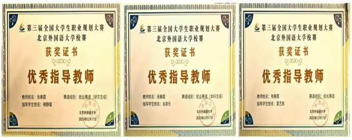 学子在北外第三届全国大学生职业规划大赛校赛决赛斩获佳绩,2025级硕士生褚静璇荣获就业赛道二等奖,2023级本科生谷泉乐荣获就业赛道三等奖,2025级本科生夏艺航荣获成长赛道三等奖。三位获奖选手的指导教师张春霞荣获“优秀指导教师”。